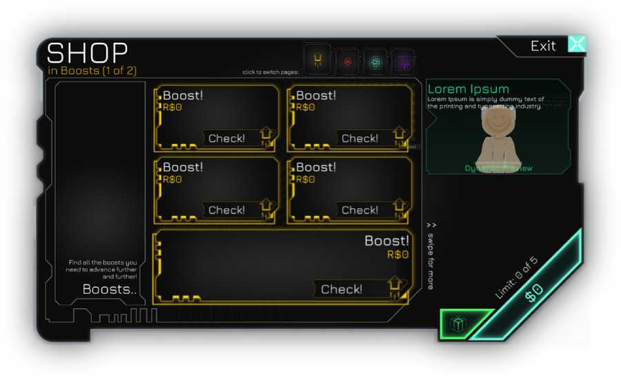 The goal of this project was to capture a Cyberpunk vibe, built entirely from scratch with no external references - just pure creativity. The shop is already live in several partner games within the genre and features a range of dynamic systems like events, rewards, currency purchases, boost activations, and more.